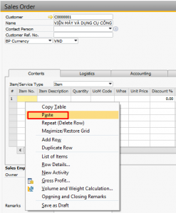 Chức năng sao chép và dán từ Excel trong SAP B1 9.1