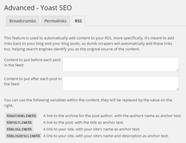 Phần Advanced cho phép các bạn chỉnh sửa các thiết lập liên quan đến Breadcrumbs, Permalinks và RSS. Vì mỗi theme lại có một cách hiển thị Breadcrumbs khác nhau và có thể hỗ trợ hoặc không, nên các bạn cần cân nhắc kỹ việc có nên kích hoạt nó hay không?