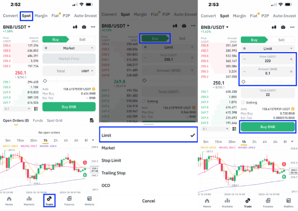 Sau khi đã có tiền (USDT hoặc coin khác) trong ví Spot, bạn có thể bắt đầu giao dịch: