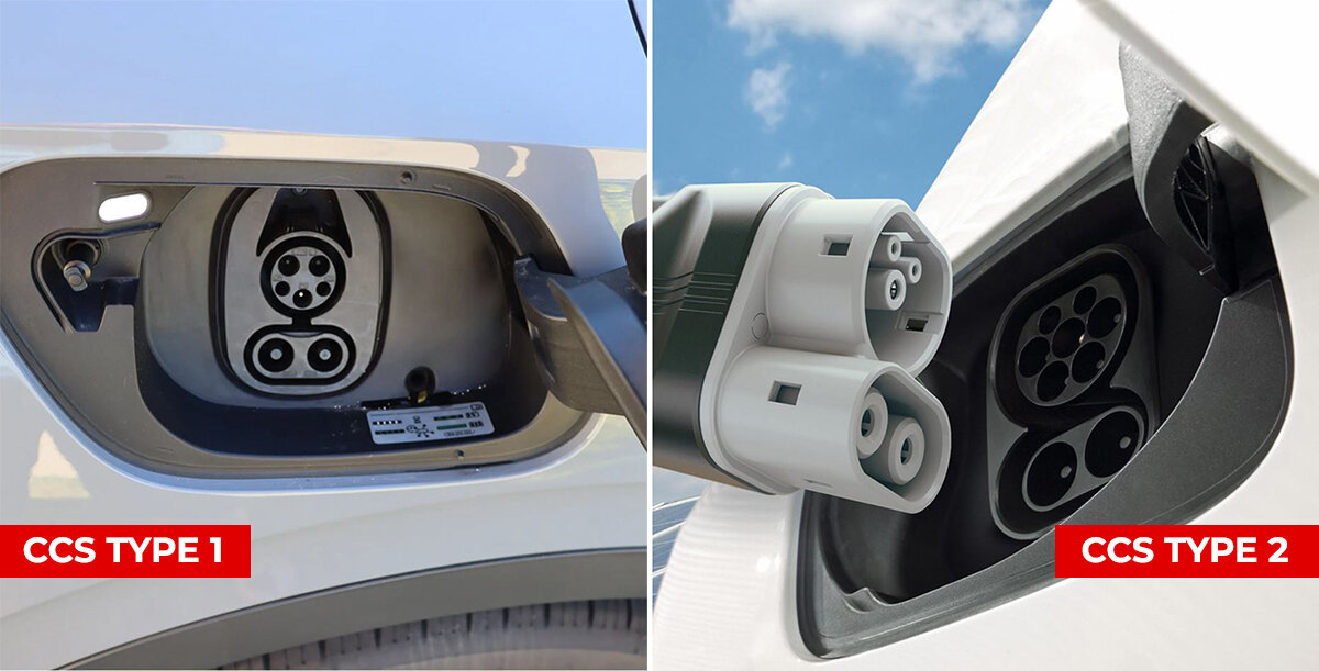 - CCS Type 2: Sử dụng đầu nối 5 chân của Type 2 cho AC và một cổng DC thêm vào, tương thích với dòng điện DC sạc công suất cao, tối đa 350 kW.