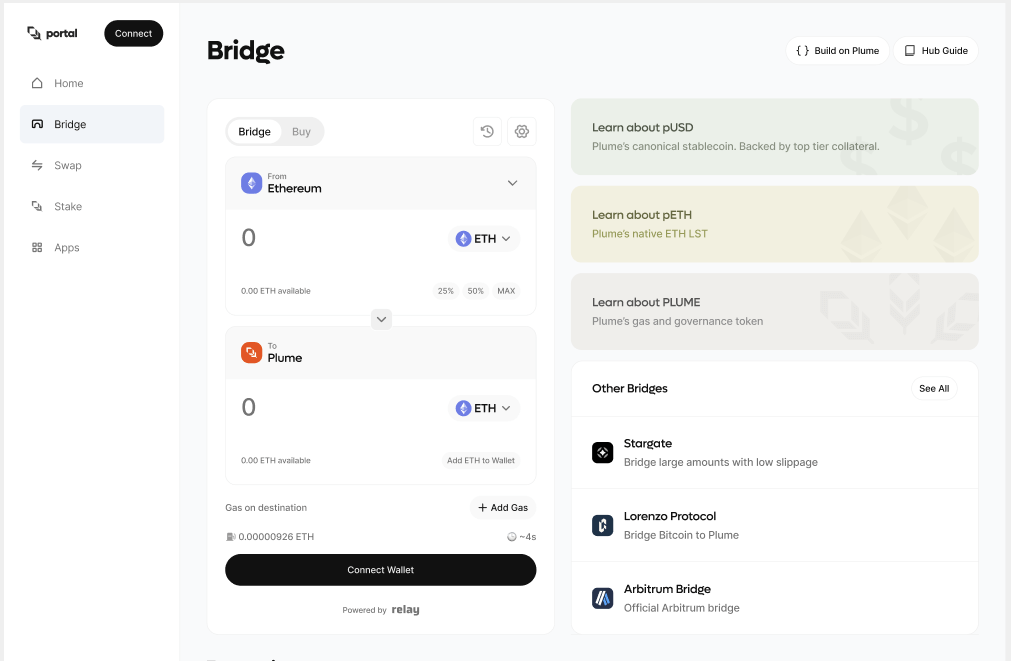 Plume hỗ trợ cầu nối cross-chain và swap trong một giao dịch nhờ vào cầu nội bộ (Relay), đồng thời hợp tác với các giải pháp hàng đầu như Stargate, Arbitrum, Relay.